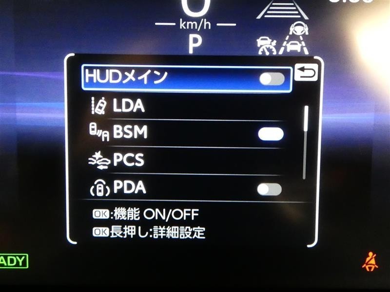 【BSM】ブラインドスポットモニターです。ミラーで確認できない自車の斜め後ろにいる車を感知してドアミラーが点灯。車線変更の危険をお知らせします。