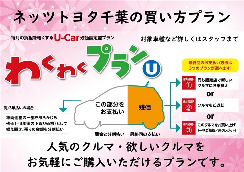 車両価格の一部をあらかじめ残価として最終回に据え置き、残りの金額を毎月お支払いいただくプランです。 *詳しくはスタッフまでお問合せください。