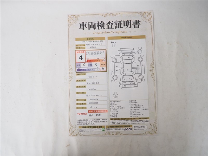 【車両検査証明書】トヨタ認定検査員が検査を実施。どなたでもわかりやすいように総合評価は10段階、内装・外装は5段階で点数表示。外装のキズの程度と場所が一目でわかるように車両展開図で記載しています。