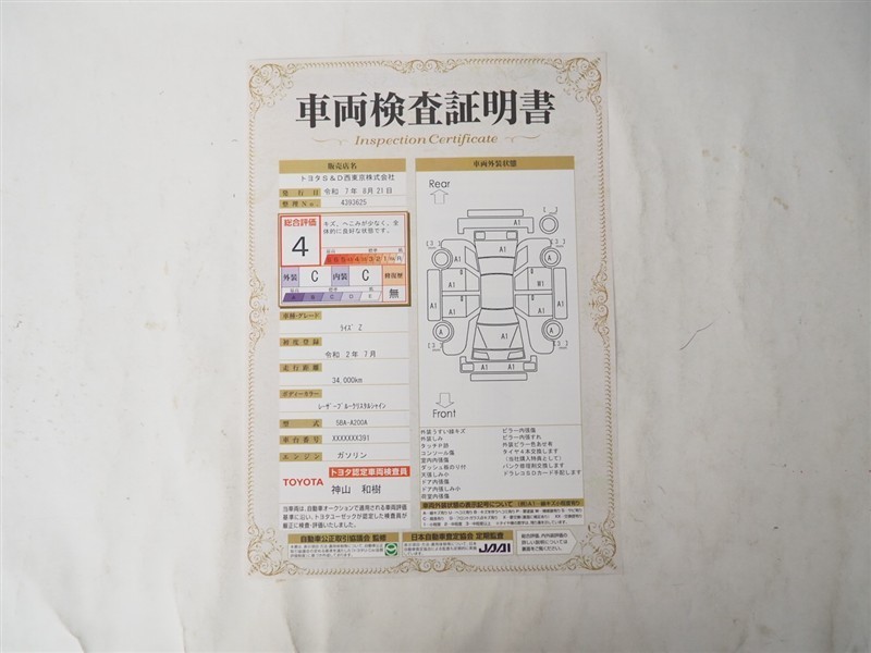 車両検査証明書に車両のキズの程度などが記載されています。細かいキズの大きさや車内の匂いなどは実際にお車をご覧ください。