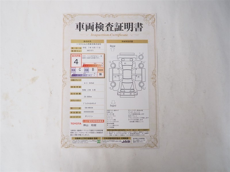 【車両検査証明書】トヨタ認定検査員が検査を実施。どなたでもわかりやすいように総合評価は10段階、内装・外装は5段階で点数表示。外装のキズの程度と場所が一目でわかるように車両展開図で記載しています。