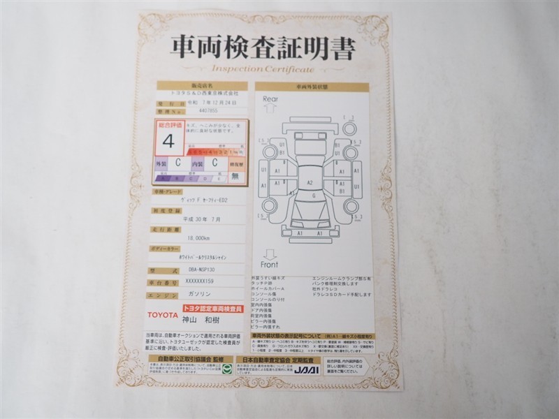 ・【車両検査証明書】トヨタ認定検査員が検査を実施。どなたでもわかりやすいように総合評価は10段階、内装・外装は5段階で点数表示。外装のキズの程度と場所が一目でわかるように車両展開図で記載しています。