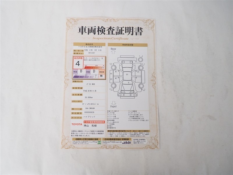 【車両検査証明書】トヨタ認定検査員が検査を実施。どなたでもわかりやすいように総合評価は10段階、内装・外装は5段階で点数表示。外装のキズの程度と場所が一目でわかるように車両展開図で記載してます。