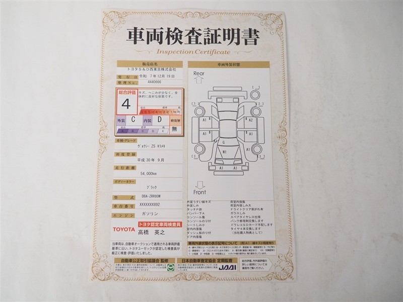 【車両検査証明書】トヨタ認定検査員が検査を実施。どなたでもわかりやすいように総合評価は10段階、内装・外装は5段階で点数表示。外装のキズの程度と場所が一目でわかるように車両展開図で記載してます。