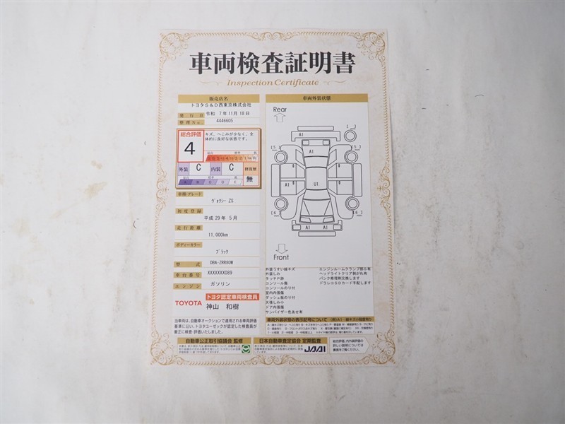 【車両検査証明書】トヨタ認定検査員が検査を実施。どなたでもわかりやすいように総合評価は10段階、内装・外装は5段階で点数表示。外装のキズの程度と場所が一目でわかるように車両展開図で記載してます。