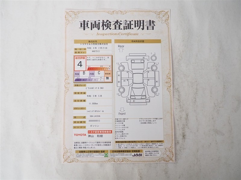 【車両検査証明書】トヨタ認定検査員が検査を実施。どなたでもわかりやすいように総合評価は10段階、内装・外装は5段階で点数表示。外装のキズの程度と場所が一目でわかるように車両展開図で記載してます。