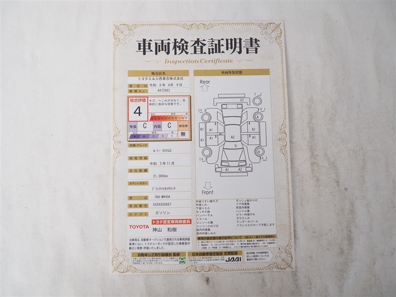・【車両検査証明書】トヨタ認定検査員が検査を実施。どなたでもわかりやすいように総合評価は10段階、内装・外装は5段階で点数表示。外装のキズの程度と場所が一目でわかるように車両展開図で記載しています。