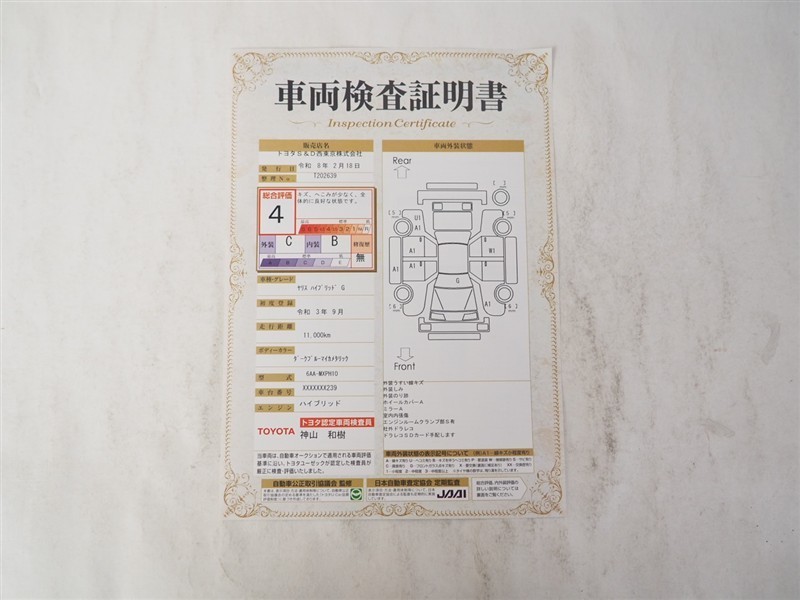 【車両検査証明書】トヨタ認定検査員が検査を実施。どなたでもわかりやすいように総合評価は10段階、内装・外装は5段階で点数表示。外装のキズの程度と場所が一目でわかるように車両展開図で記載してます。