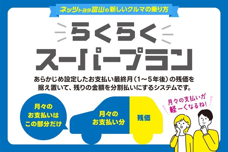 車両本体価格の一部をあらかじめ残価(=3年後や5年後の予想下取り価格)として据え置き、残りの金額を分割でお支払いいただくプランとなります。通常のクレジットよりも月々の支払い金額が抑えられます。
