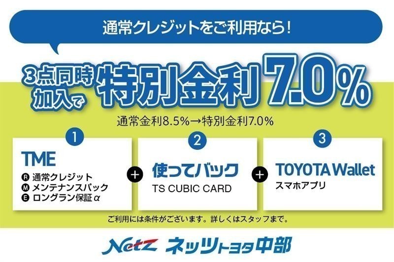 TME(通常クレジット・メンテパック・ロングラン保証)+使ってバック+TOYOTAWalletをまとめて申込みされた方は基本金利8.5%を7%に特別金利で提供させていただきます。詳しくはスタッフまで