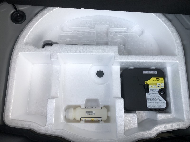 もしパンクをしてしまったら、この溶剤をエア注入口より入れて応急処置をして下さい。重たいスペアタイヤを積んでいるより燃費の向上になるので、パンク修理キット搭載の車が増えているんです。
