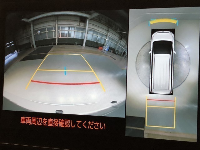 車の全周囲の画像が表示されます。運転席から見づらい個所なども、上空から見たような映像で確認できます。映像のきりかえも出来、後方確認だけでなく大変便利な機能です。
