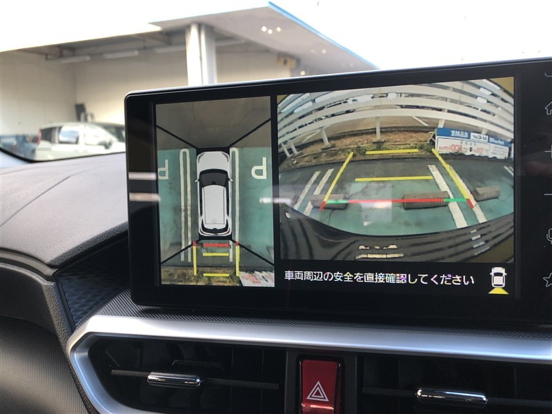 車の全周囲の画像が表示されます。運転席から見づらい個所なども、上空から見たような映像で確認できます。映像のきりかえも出来、後方確認だけでなく大変便利な機能です。