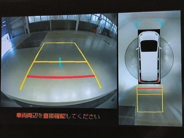 車の全周囲の画像が表示されます。運転席から見づらい個所なども、上空から見たような映像で確認できます。映像のきりかえも出来、後方確認だけでなく大変便利な機能です。