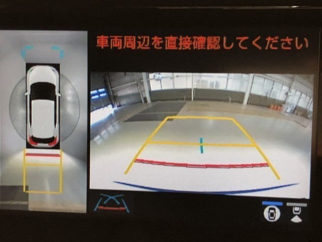 車の全周囲の画像が表示されます。運転席から見づらい個所なども、上空から見たような映像で確認できます。映像のきりかえも出来、後方確認だけでなく大変便利な機能です。