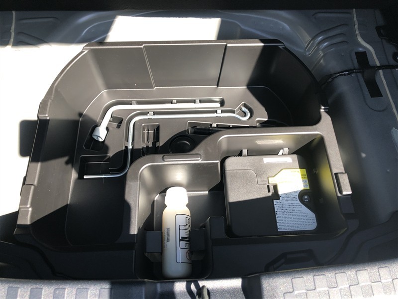 もしパンクをしてしまったら、この溶剤をエア注入口より入れて応急処置をしてください。重いスペアタイヤを積んで走るより燃費向上になるので、パンク修理キット搭載車が増えてます。