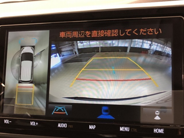 車の全周囲の画像が表示されます。運転席から見づらい個所なども、上空から見たような映像で確認できます。映像のきりかえも出来、後方確認だけでなく大変便利な機能です。