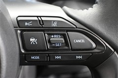 ステアリングスイッチ右側にはレーダークルーズコントロール(全車速追従機能付)付きです。車速に応じて追従支援してくれるので、ロングドライブも快適です。詳細は販売店スタッフまでおたずねください。
