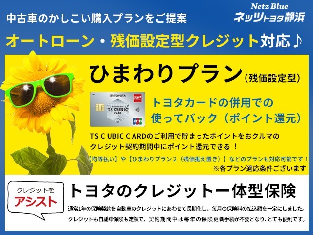 【残価設定型クレジット保険一体型】中古車のかしこい買い方をご提案いたします。トヨタカード(TS CUBIC CARD)併用でポイント還元。お客様のライフスタイルに合わせた購入プランをご提案。