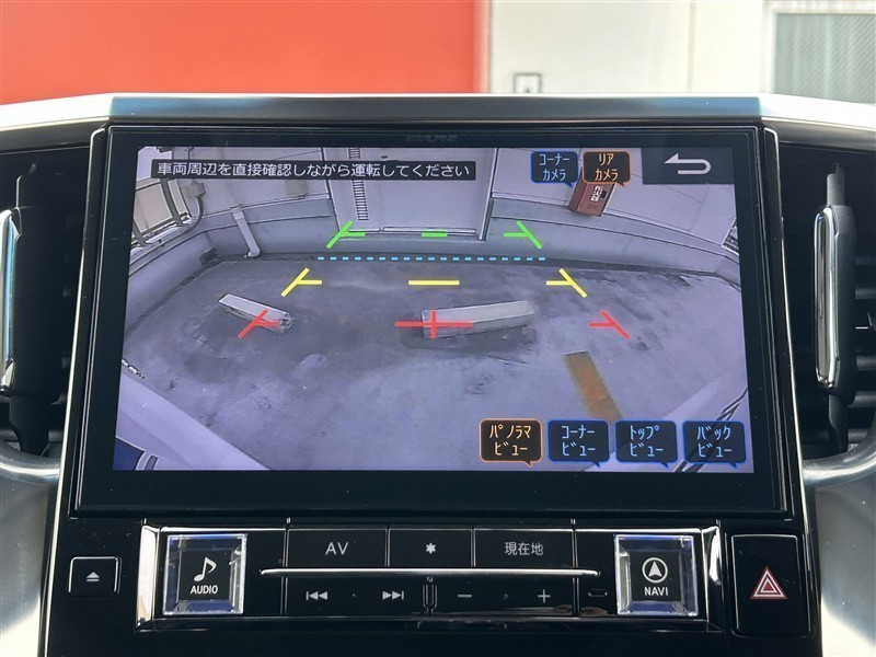 社外バックカメラ搭載。ガイドライン表示があるので駐車も安心です!「パノラマビュー」「コーナービュー」「トップビュー」「バックビュー」に切り替え可能です。