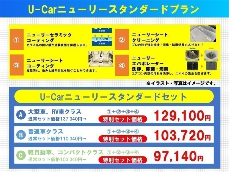 ・ニューリーセラミックコーティング(ガラス系の固い膜が塗装を保護します) ・ニューリーシートクリーニング(プロの技で強力洗浄。消臭、除菌効果あります) ・ニューリーシートコーティング(油脂汚れ、染み経年劣化を防ぎます) ・ニューリーエバポレーター洗浄、除菌、消臭(エアコン内部洗浄し臭いの発生を防ぎます)