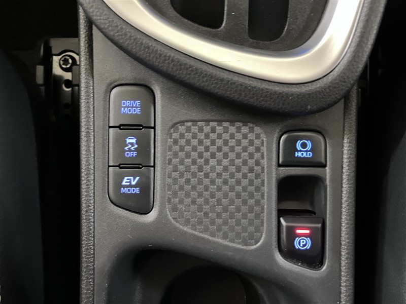 ハイブリッド走行モード選択、トラクションコントロール(横滑り防止装置)、電動パーキング等のスイッチが配置されています。