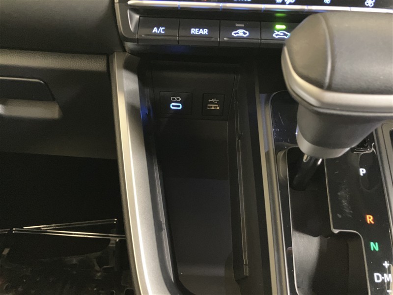 シフトレバーの左側のカバーを外すとオーディオ機器やスマートフォンを直接カーオーディオに接続できるUSB端子や充電用USB端子が配置されています。