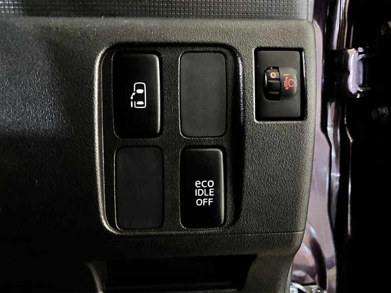 後席の左側電動スライドドアは運転席側からも操作できます。ON/OFFの切り替えが出来ますので、状況によって使い分けられます。アイドリングストップのスイッチも配置されています。