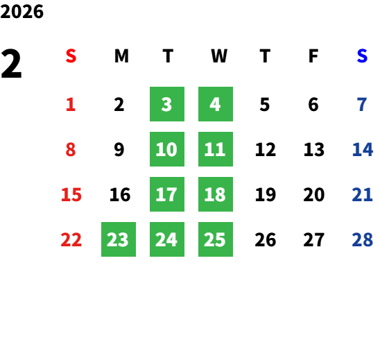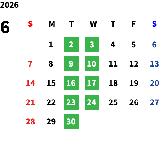 毎週火曜日及び第1・第2・第3・第4水曜日、祝日月曜日