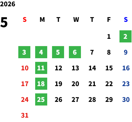 毎週月曜日(一部祝日営業日あり)詳しくは営業日カレンダーをご確認ください。