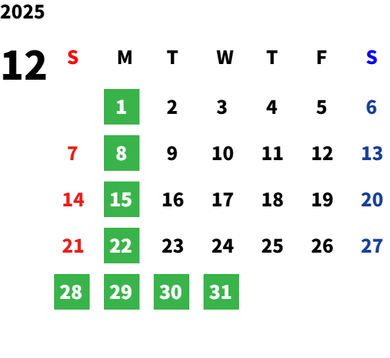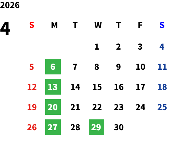 毎週月曜日(一部祝日営業日あり)詳しくは営業日カレンダーをご確認ください。