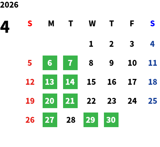 月曜日(月曜祝日営業の場合は火曜日)、第1火曜日(2月・8月は除く)
