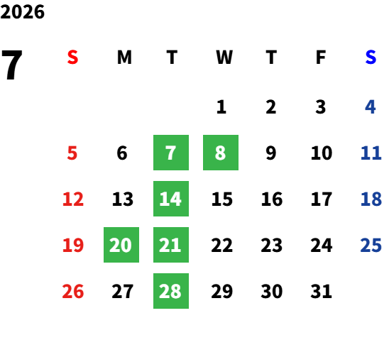 毎週火曜日・第二水曜日・祝日(5/6除く)