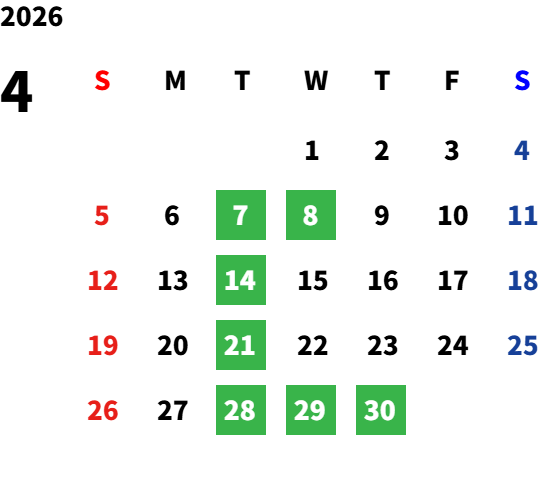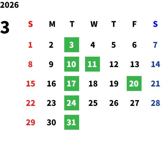 毎週火曜日・第二水曜日・祝日(5/6除く)