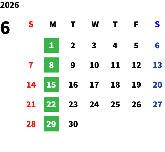 月曜日(詳細は下記の営業日カレンダーをご確認ください。)