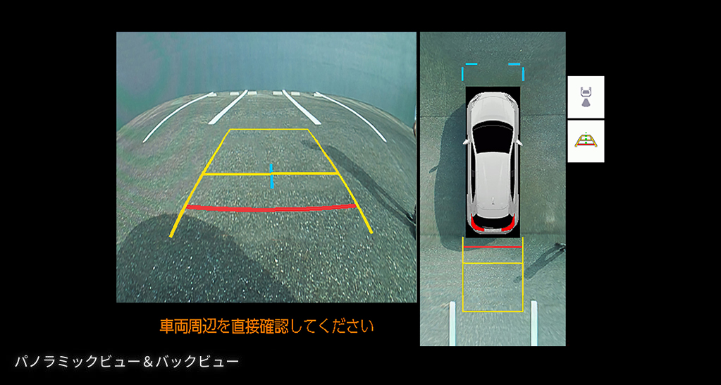 車両前側を後ろから見たような映像を表示。狭い道でのすれ違いや路肩への幅寄せ時に、車両側方の安全確認をサポートします。